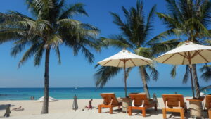 シュノーケリングをやらないで、ビーチでのんびりしている人も多くいました。海の先に見える島が次の目的地ピピ ドン島です。バンブー島から5キロほどの距離です。