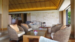 先に掲載したのと同じ写真ですが、もう1度見てみてください。写真左手の窓側が「The Lounge」、右手が動線になっています。写真には写っていませんが、右手奥にエレベーターがあり、手前側に向かって進んで左に折れた先に、フロントがあります。