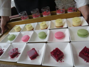 スイーツを別角度から。写真手前の赤い一品は、ホワイトチョコレートとピスタチオ、ラズベリーのケーキ。美しい見た目の通り、味も洗練されていてハイレベルです。