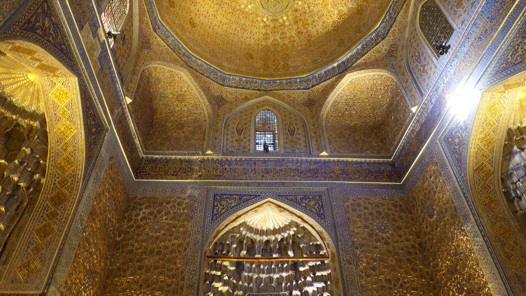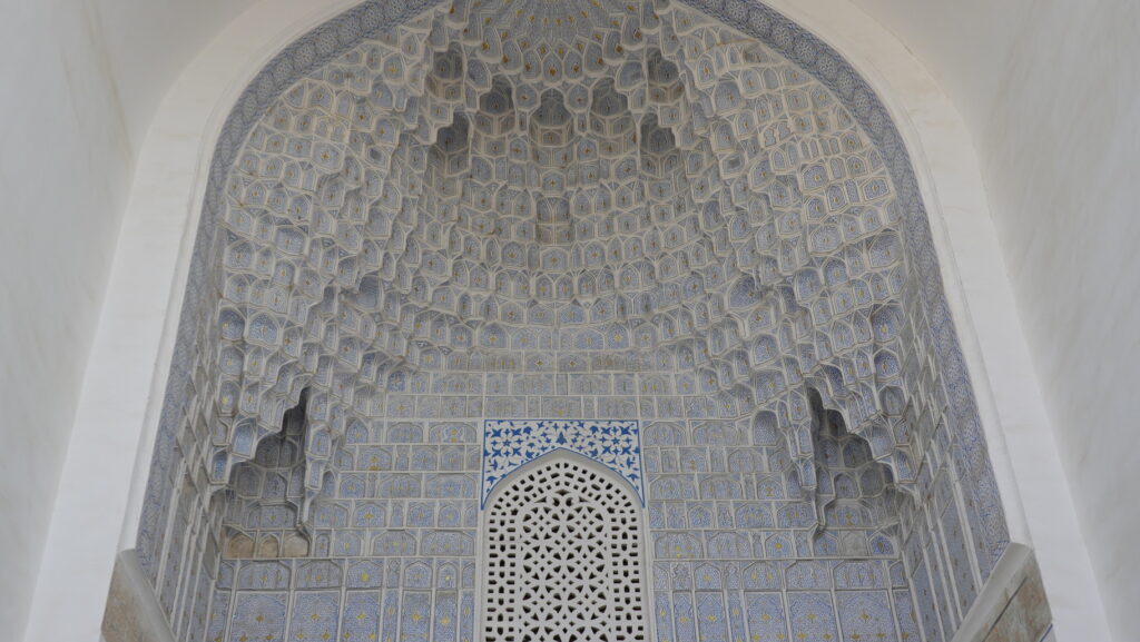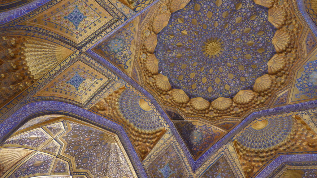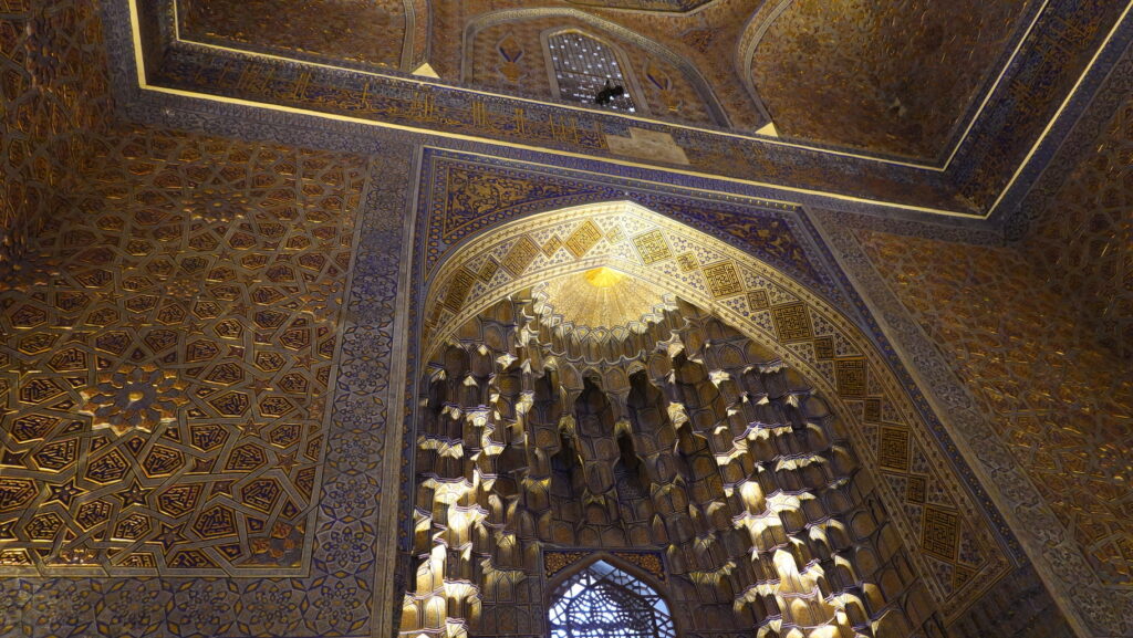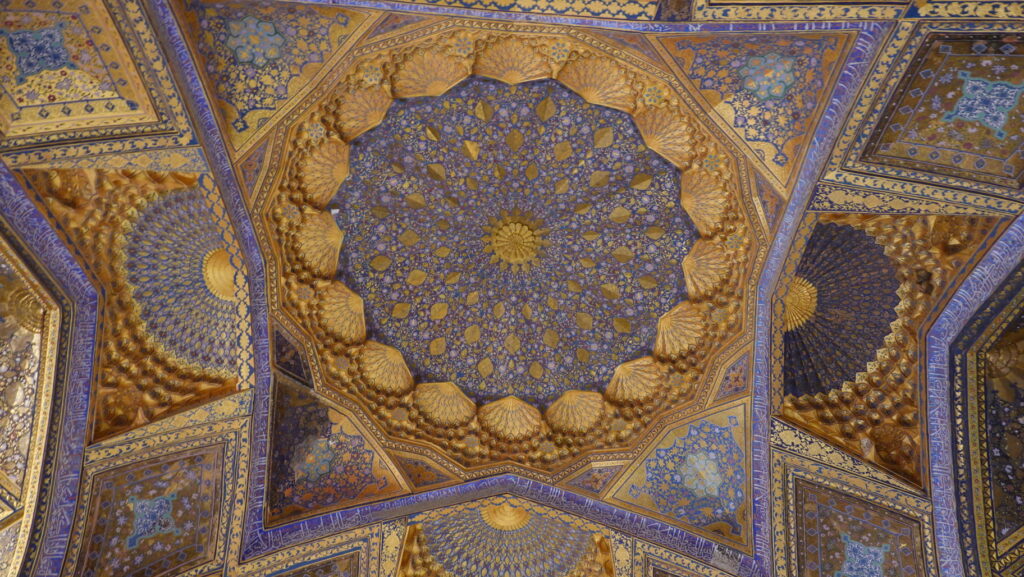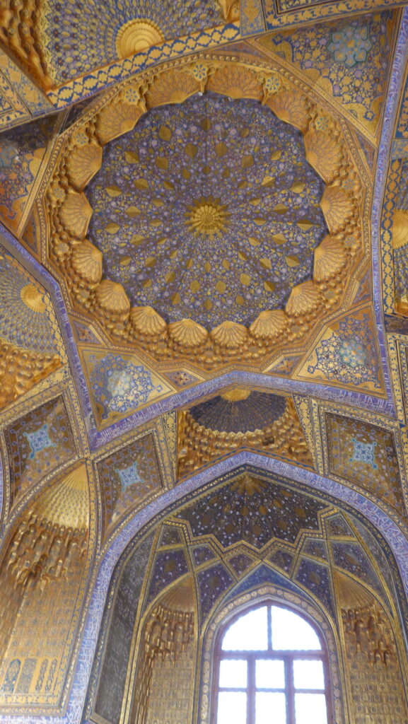 ちなみに、ティムール廟はこのように全面金ピカですが、実際に使われている金の量は、レギスタン広場にあるティラカリ・マドラサのモスクの方が多いという推定結果があるらしいです。