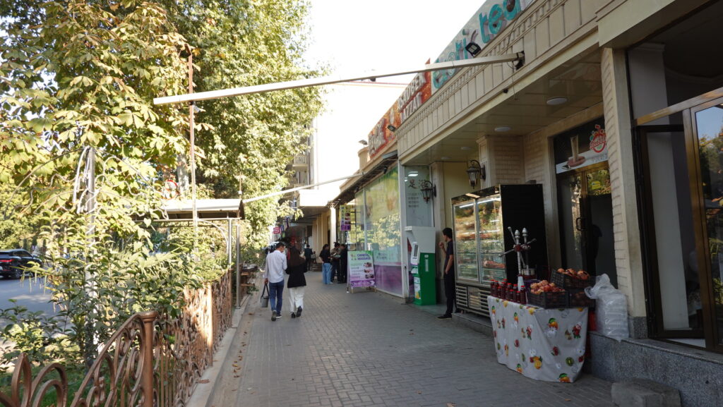 2日目 16:10 レギスタン広場を出て、幹線道路(レギスタン通り)を西に向けて歩きます。通り沿いはレストランなどが軒を連ねています。