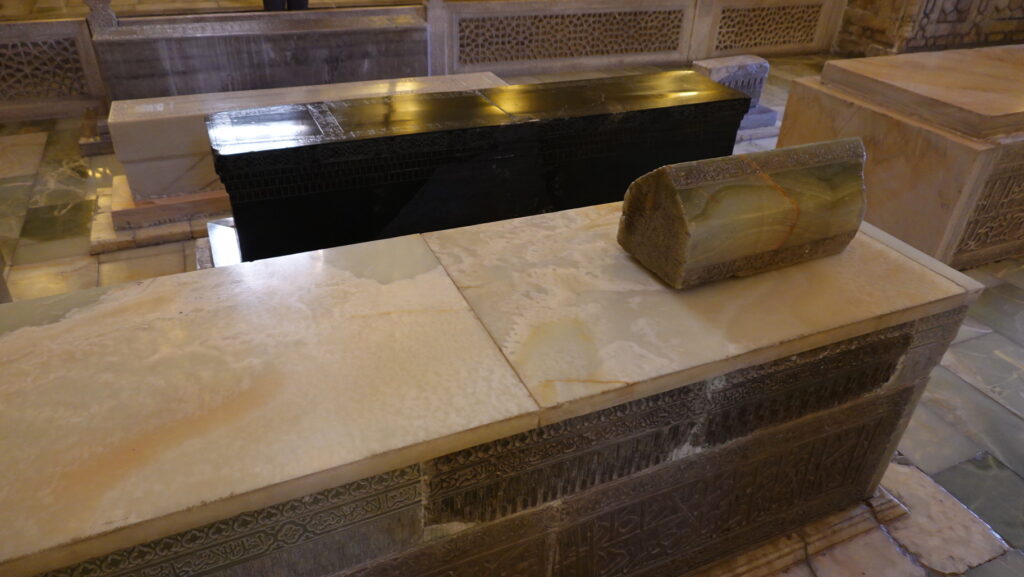 黒光りしている小ぶりな墓標がティムール、手前がムハンマド・スルタンのものです。亡骸を収めた棺はこの廟の地下にあるといいます。もちろん、観光客が見ることはできません。