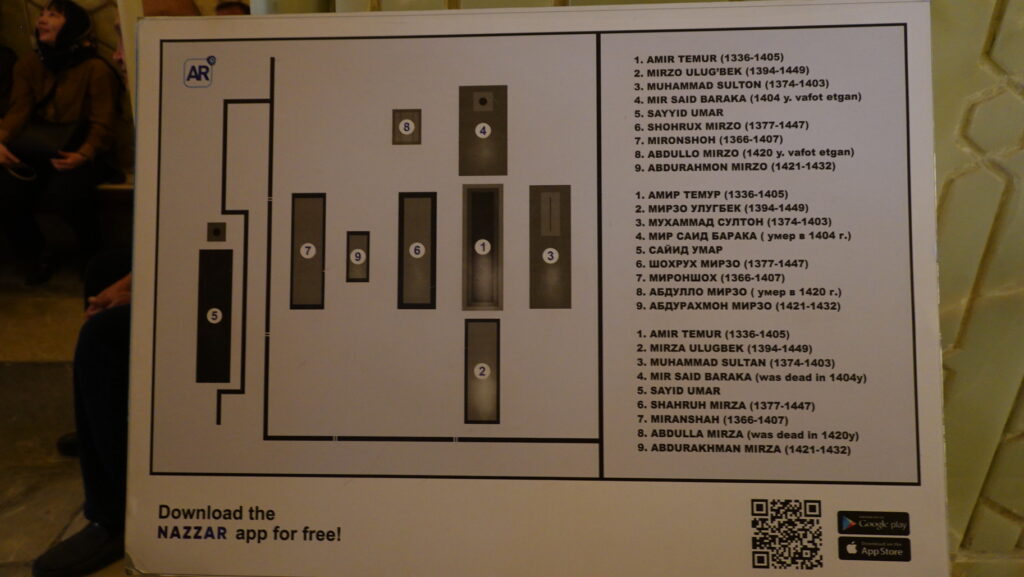 墓標の説明文です。天文台で有名なウルグベクも、この地に眠ります。2番の墓標です。ウルグベクはティムールの孫になります。