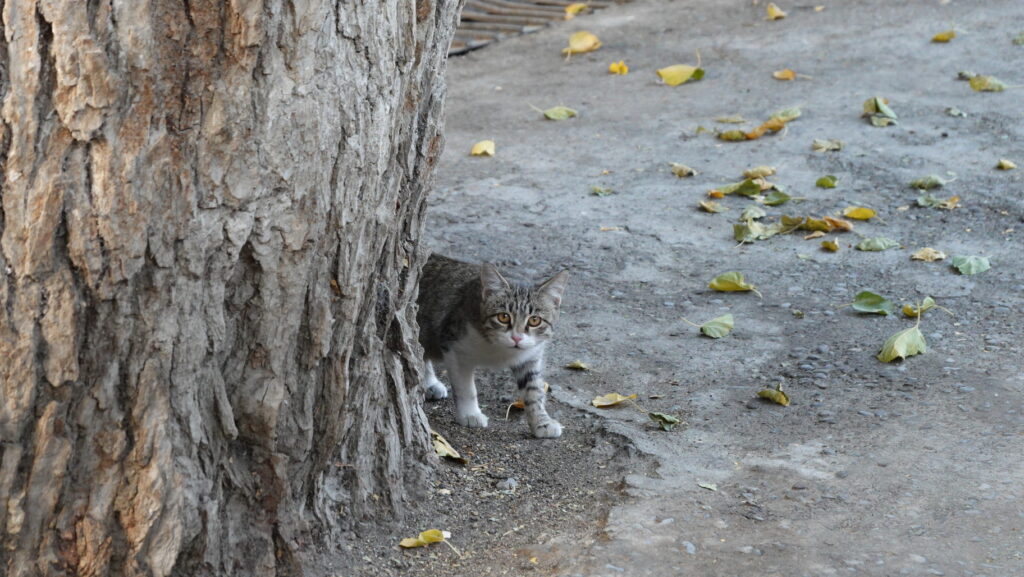 外に出ると、木の陰にサバ白の子猫がいました。猫が街のいろいろなところにいて、住民たちに大事にされているのが、イスラム圏のいいところです。