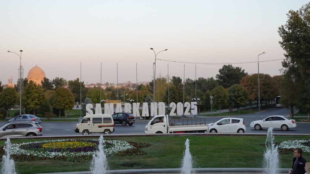 ティムール像から幹線道を見た景色。夕日に照らされたティムール廟のドームが見えます。手前にある「SAMARKAND 2025」の立て看板は、ワシントン条約第20回締約国会議に向けた宣伝用のものだったのではないかと思います。2025年11月24日から12月5日にかけて、ここサマルカンドで会議が催されることになっていました。ウナギの国際取引の規制が提案されて、否決されたというニュースは、日本でも大きく報じられました。