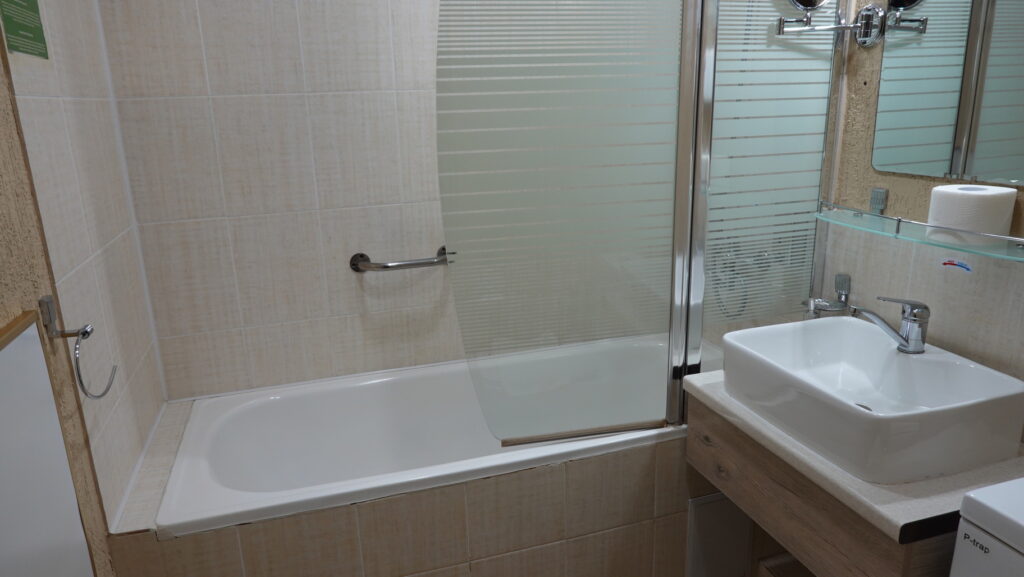 風呂場です。ユニットバスの仕様です。清潔に保たれてはいます。ただ、バスタブと手前の洗面台の間に、水が飛び散るのを防ぐための可動式のカバーがイマイチでした。バスタブの縁とカバーとの間に隙間があるため、シャワーの水が手前の洗面台側に侵入するのをどうしても防げないのです。シャワーを浴びると、洗面台側の床が、随分濡れました。
