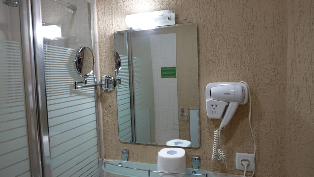 あてがわれた部屋です。正直言って、入ってみて「あれっ」と思いました。やや年季を感じるつくりです。予約サイトなどを見ると、もっときれいで広そうな部屋があったので、そちらに泊まれるものだと思っていました。われわれは「スタンダード ダブルルーム」の予約だったのですが、ネットで見た部屋は「デラックス ダブルルーム」や「デラックス ツインルーム」だったようです。