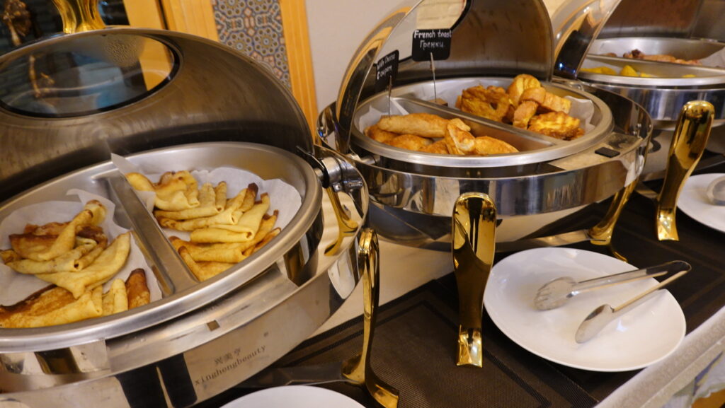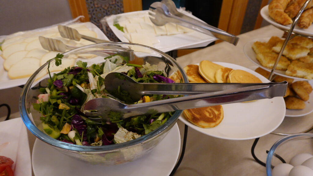 野菜や果物など、このくらいはあってほしいなというレベルのものは、一通りそろっている印象でした。サマルカンドで泊まったモーベンピックと比べるとさすがに落ちますが、そりゃ料金が違いすぎるので、それをもってこちらを悪く言うことはできません。