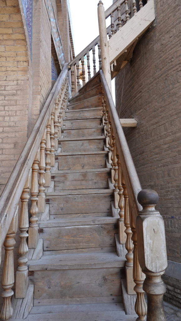 こちらの外階段から登っていきます。イスラム・ホジャ・マドラサは共通チケットで入場できるのですが、このミナレットに登るには別途料金が必要です。1人100,000スムです。