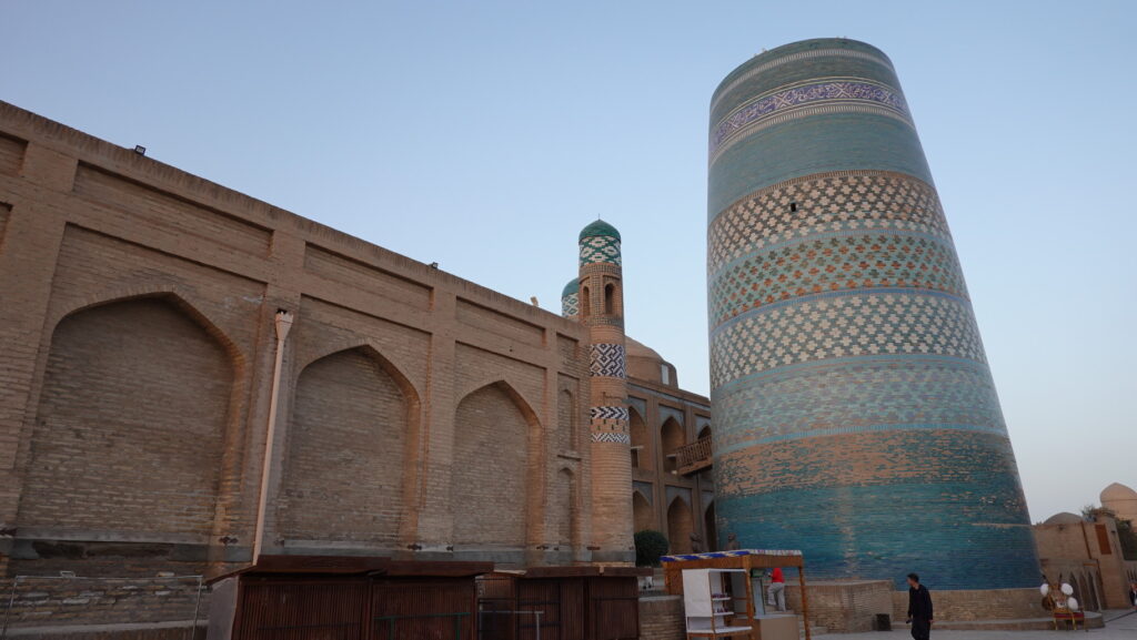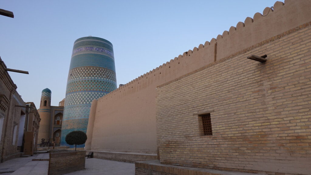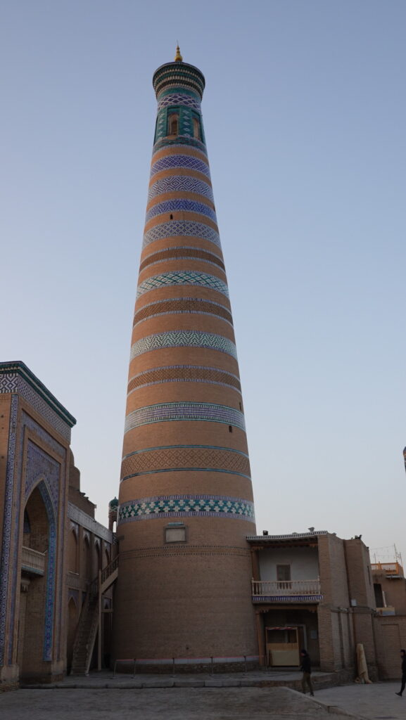 6泊8日で、サマルカンド、ブハラ、ヒヴァ、タシケントを巡る個人旅行の6日目です。この日は、イチャン・カラを歩き回ります。まずはイスラム・ホジャのミナレットとタシュハウリ宮殿です。2025年10月の旅です。