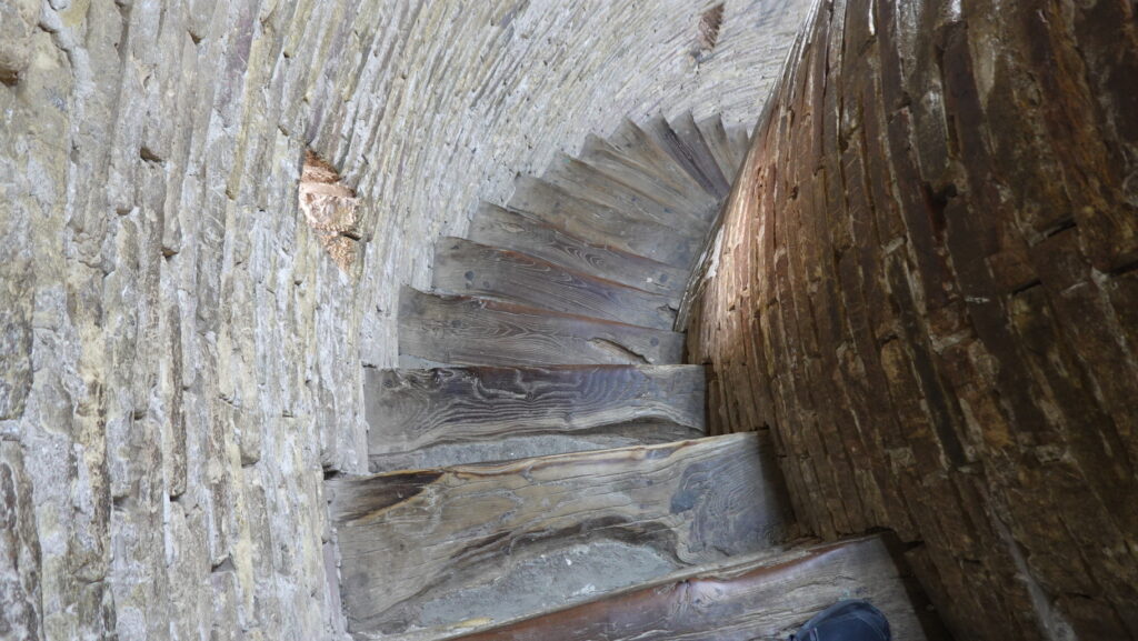 外階段から塔の内側の階段に入ります。幅は狭く、かなりの急こう配です。写真の上部に、降りてくる人が足を止めて待ってくれているのが写っていますが、すれ違う際にはやはり、どちらかが止まっていないと危険です。譲り合って事故がないよう登りましょう。