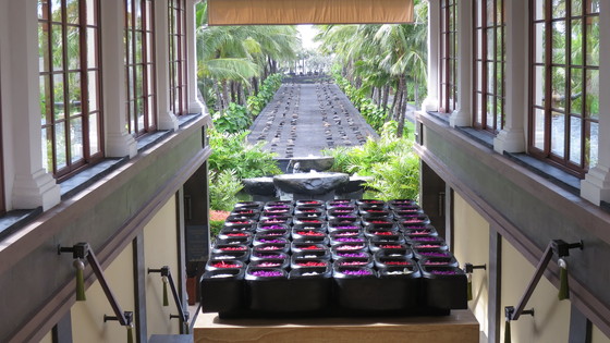 花のオブジェに歓迎されて Tギャラリアから30分、セントレジス・バリに到着。ゲートでセキュリティチェックがあります。 ウェルカムドリンク。ちょっと酸味のある柑橘系。 ひときわ目を引く花のオブジェ。ロビーから庭へ続く階段にあります。無数の花びら... -