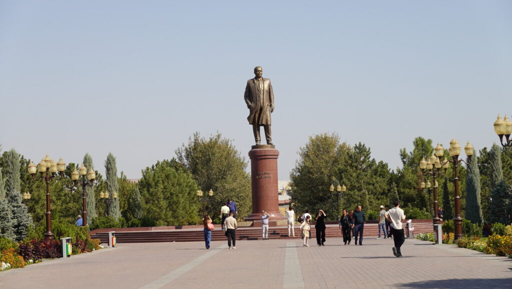 2日目 13:30 南北に伸びるイスラム・カリモフ通りを南の方に向かうと、左手に広場が見えてきます。ここにイスラム・カリモフ像があります。ウズベキスタンがソビエト連邦から独立した際の初代大統領です。権力者およびその取り巻きは古今東西、像を作りたがるものです。