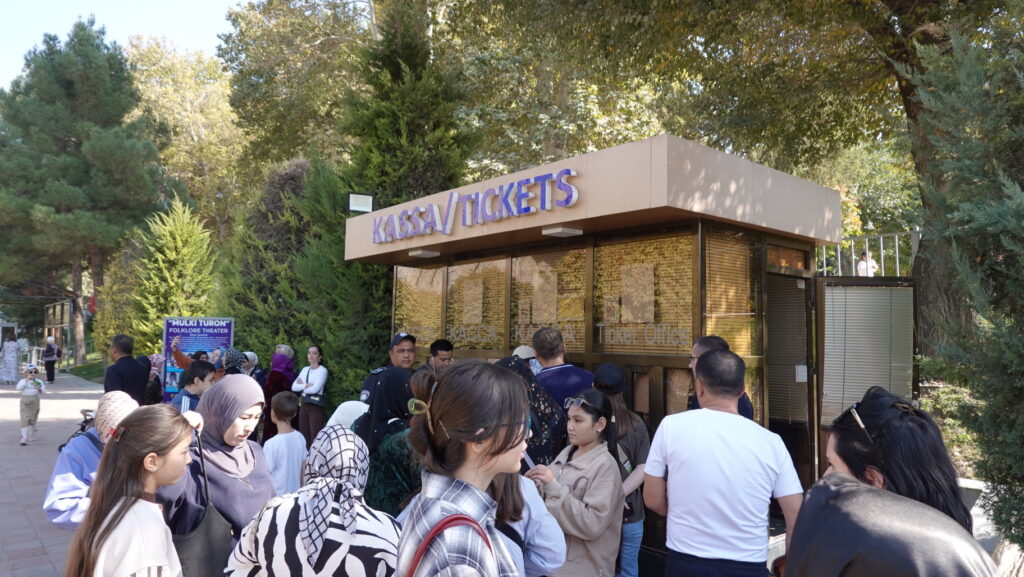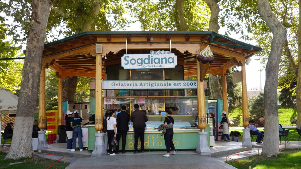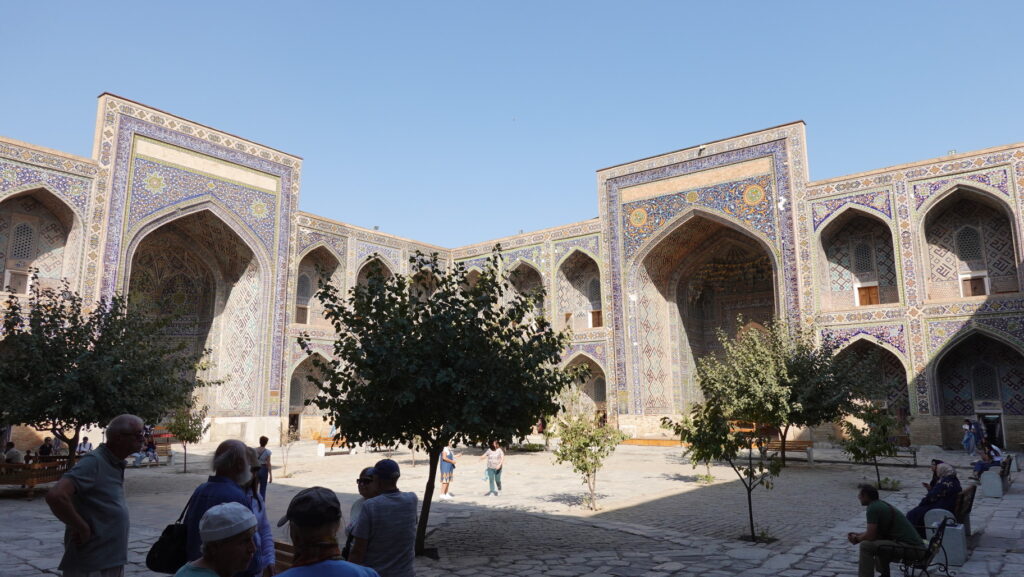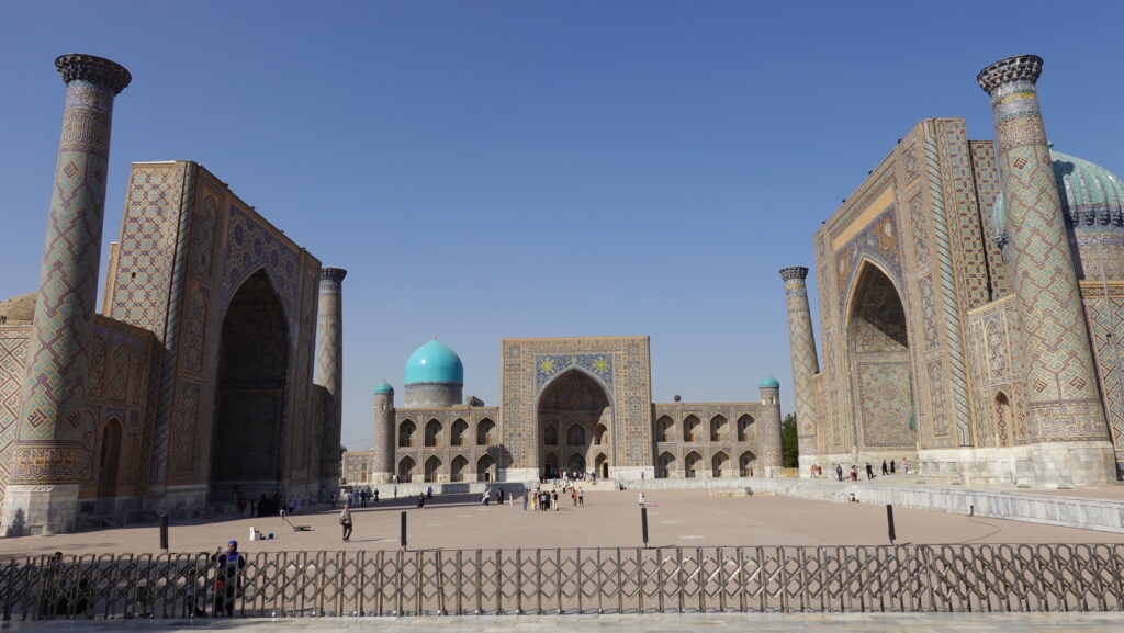 6泊8日で、サマルカンド、ブハラ、ヒヴァ、タシケントを見て回る個人旅行の2日目は、サマルカンド観光です。午前中にシャーヒ・ズィンダ廟群、ビビハニム・モスク、ビビハニム廟を見て、ビビ・ハニム ティーハウスで昼食を取り、これからレギスタン広場に向かいます。2025年10月の旅です。