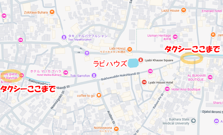 イスマイール・サーマーニー廟は、われわれが泊まったホテル マリカ ブハラから1.8㎞あります。さすがに歩くのはしんどい距離なので、ここはYandexでタクシーを呼びます。ただし、タクシーは旧市街の中心地まで入ってくることはできません。タクシーが来ることができるスポットまで行って待ちます。下の画像は、旅行記⑬に貼り付けたものと同じですが、われわれはマップ左手の「タクシーここまで」のポイントから乗りました。ホテル マリカ ブハラからすぐなので都合が良かったです。