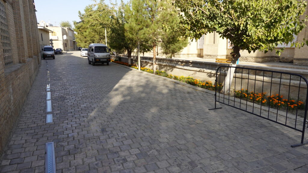 われれれがイスマイール・サーマーニー廟へ向かうにあたって、タクシーに乗ったポイントです。ご覧のように鉄柵があります。朝がまだ早いので横によけられていますが、おそらく、日中から夜の早い時間は、道をふさぐように柵を置いて規制しているのだと思います。