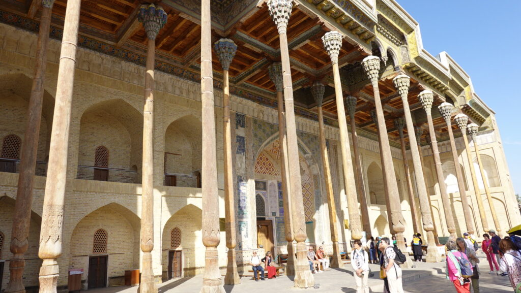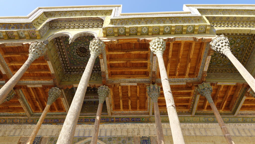 10:00 ボロハウズ モスクに到着。20本の木製の柱が、庇のように広がる屋根を支えているのが特徴です。柱はクルミの木らしく、高さは12m。創建は1712年。ブハラ・ハン国(1500~1920年)の中期に当たり、イスマイール・サーマーニー廟やレギスタン広場のマドラサと比べると、かなり後の時代のものになります。