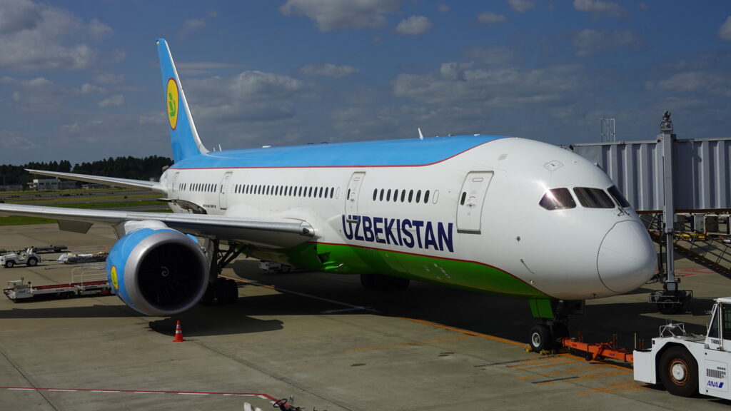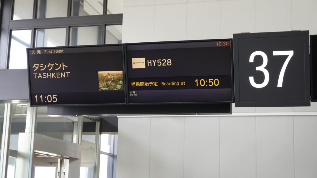 1日目 11:05 成田空港から出発です。利用するのはウズベキスタン航空。かつて同社は関西国際空港からも直行便を出していたようですが、現在は成田が唯一の直行便になります。