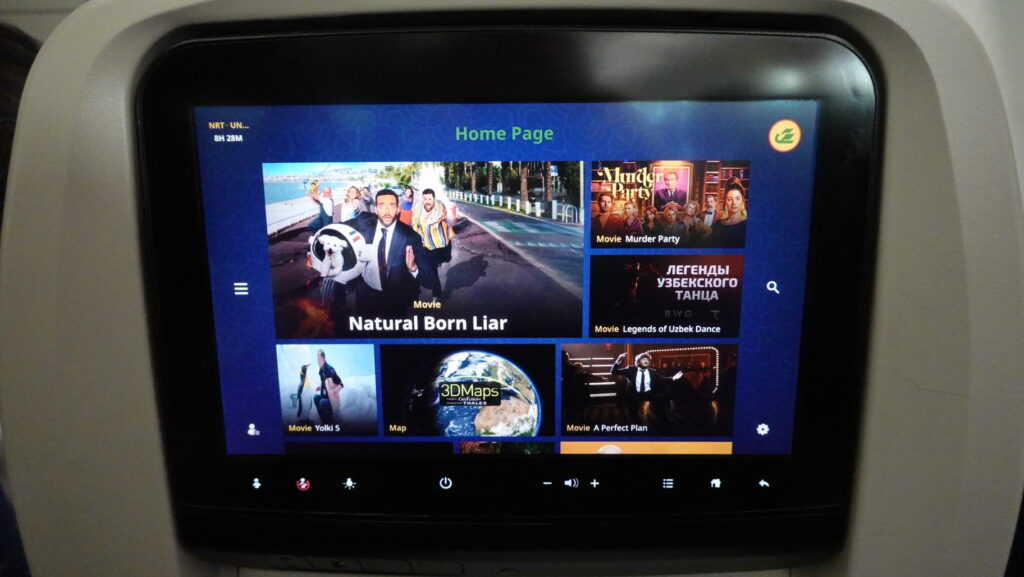 機内モニターです。映画に関して、邦画はないし、日本語字幕が出る作品もありません。音楽はウズベキスタンのポップスを聴くことができるので、それはそれで貴重かもしれません。