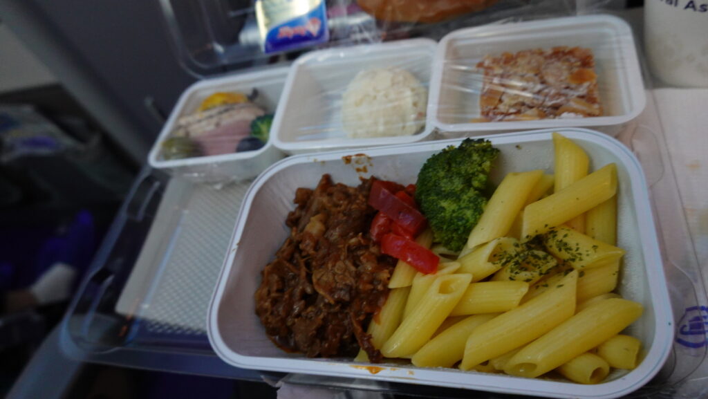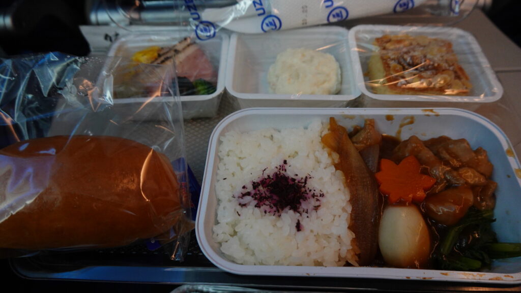 機内食です。チキンは醤油ベースの煮込み料理で、見ての通り、白米付きで日本食でした。